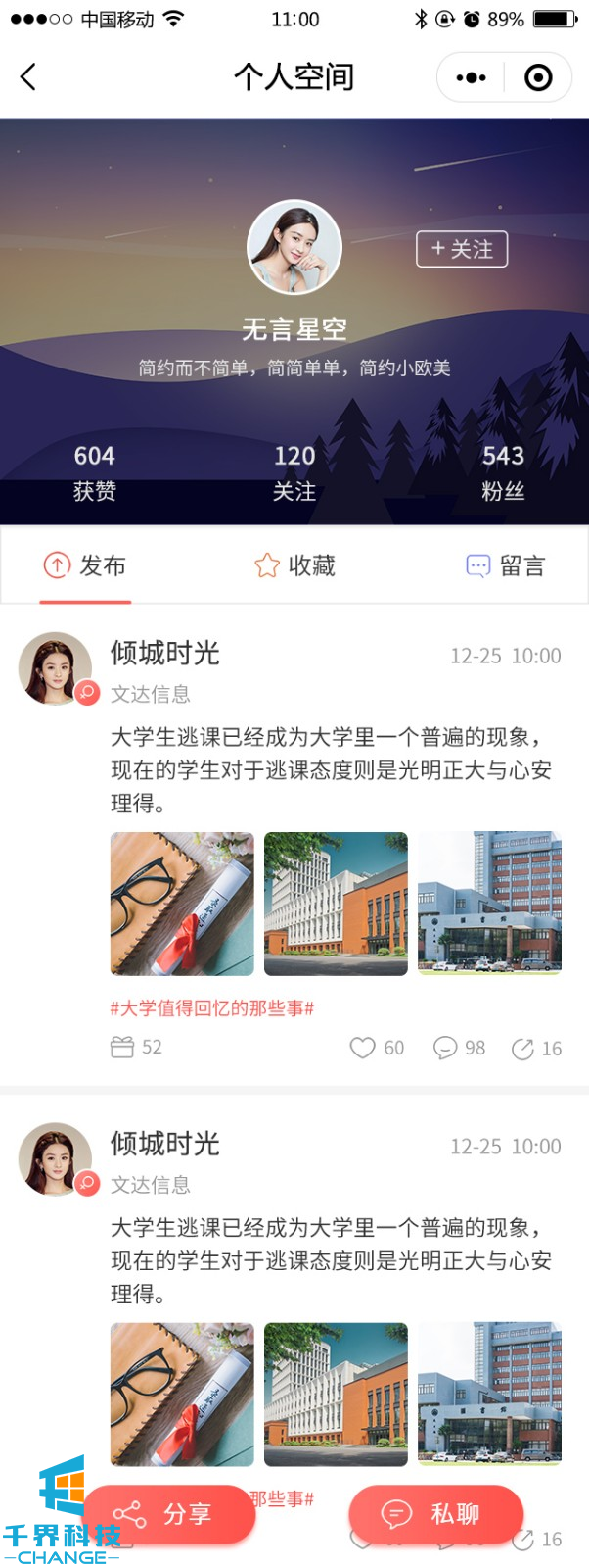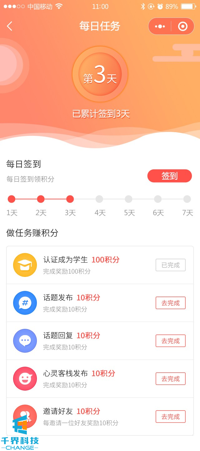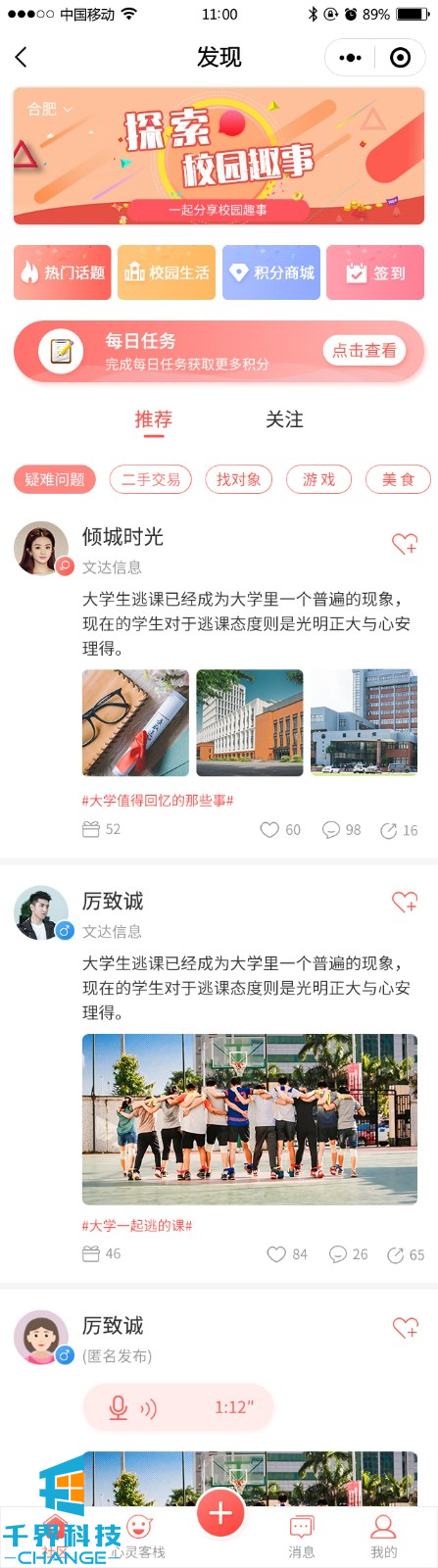 一款針對學(xué)生的綜合社交平臺,包含話(huà)題、點(diǎn)贊、分享、個(gè)人空間、在線(xiàn)簽到、完成任務(wù)、心靈社區等等