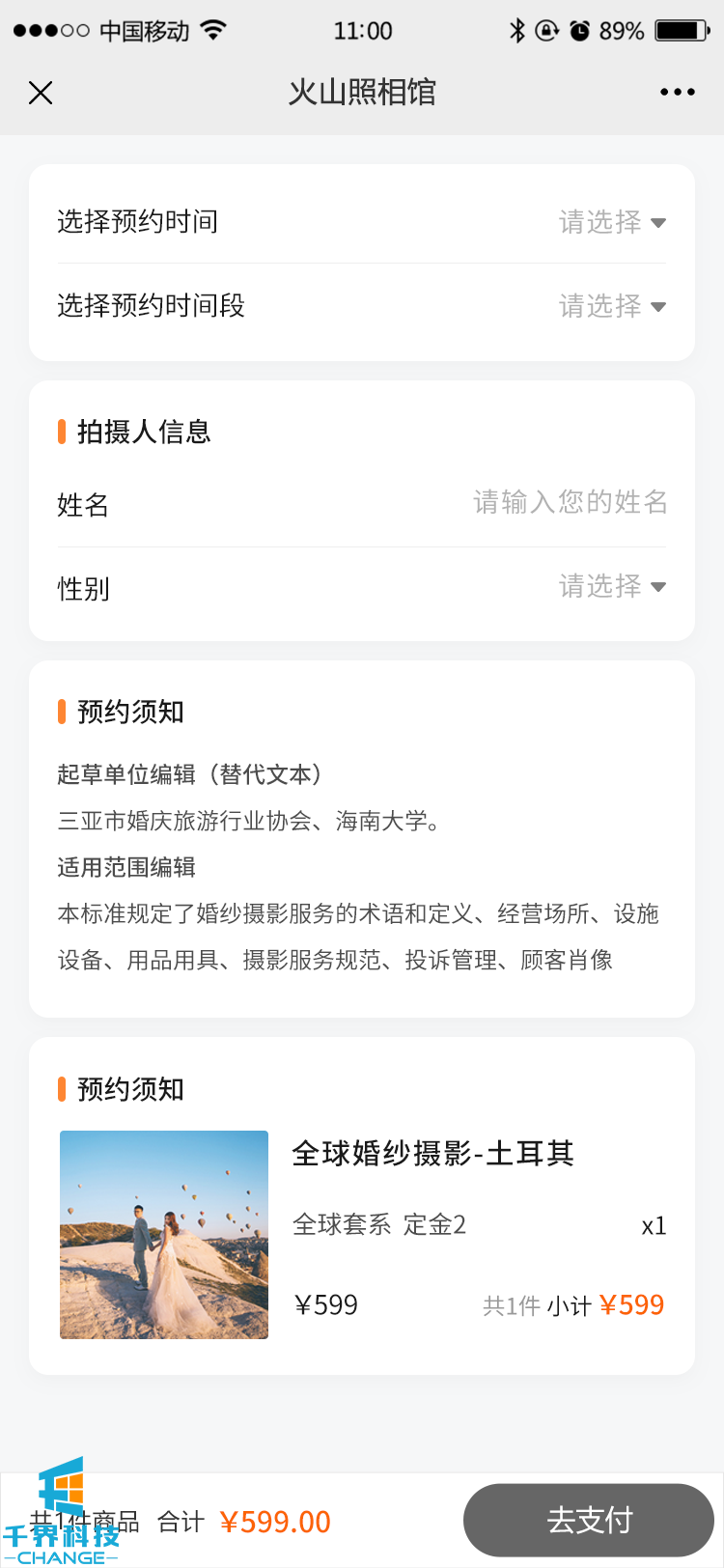 該項目是一個(gè)單門(mén)店的攝影預約公眾號,主要功能有用戶(hù)可以在公眾號預約攝影套餐,后臺接單安排線(xiàn)下預約攝影。后臺有預約排期管理等功能。